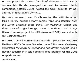 He has composed over 20 albums for the KPM Recorded Music Library, covering many genres: Town and Country, Pure Big Band, Essential Brass Band, The Romantic Album, and 3 CDs of original songs: Classic Sounds & Classic Songs. His most recent project for KPM, (released 2007), was a double CD: Jazz Anthology.