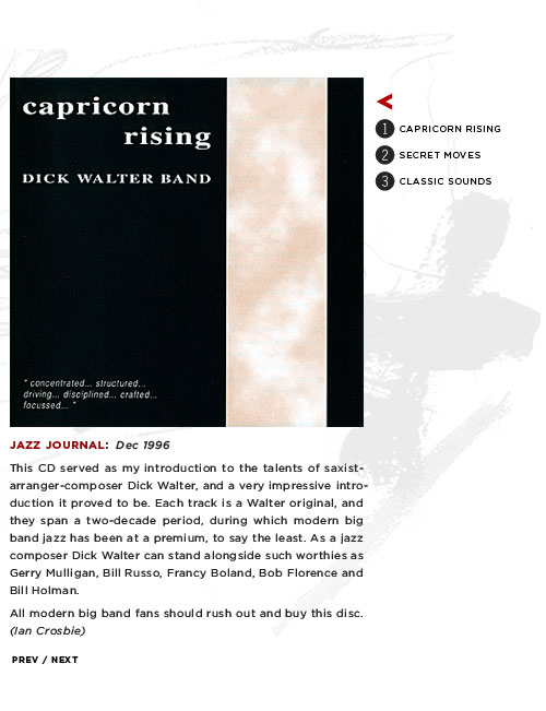 This CD served as my introduction to the talents of saxist-arranger-composer Dick Walter, and a very impressive introduction it proved to be. Each track is a Walter original, and they span a two-decade period, during which modern big band jazz has been at a premium, to say the least. As a jazz composer Dick Walter can stand alongside such worthies as Gerry Mulligan, Bill Russo, Francy Boland, Bob Florence and Bill Holman.